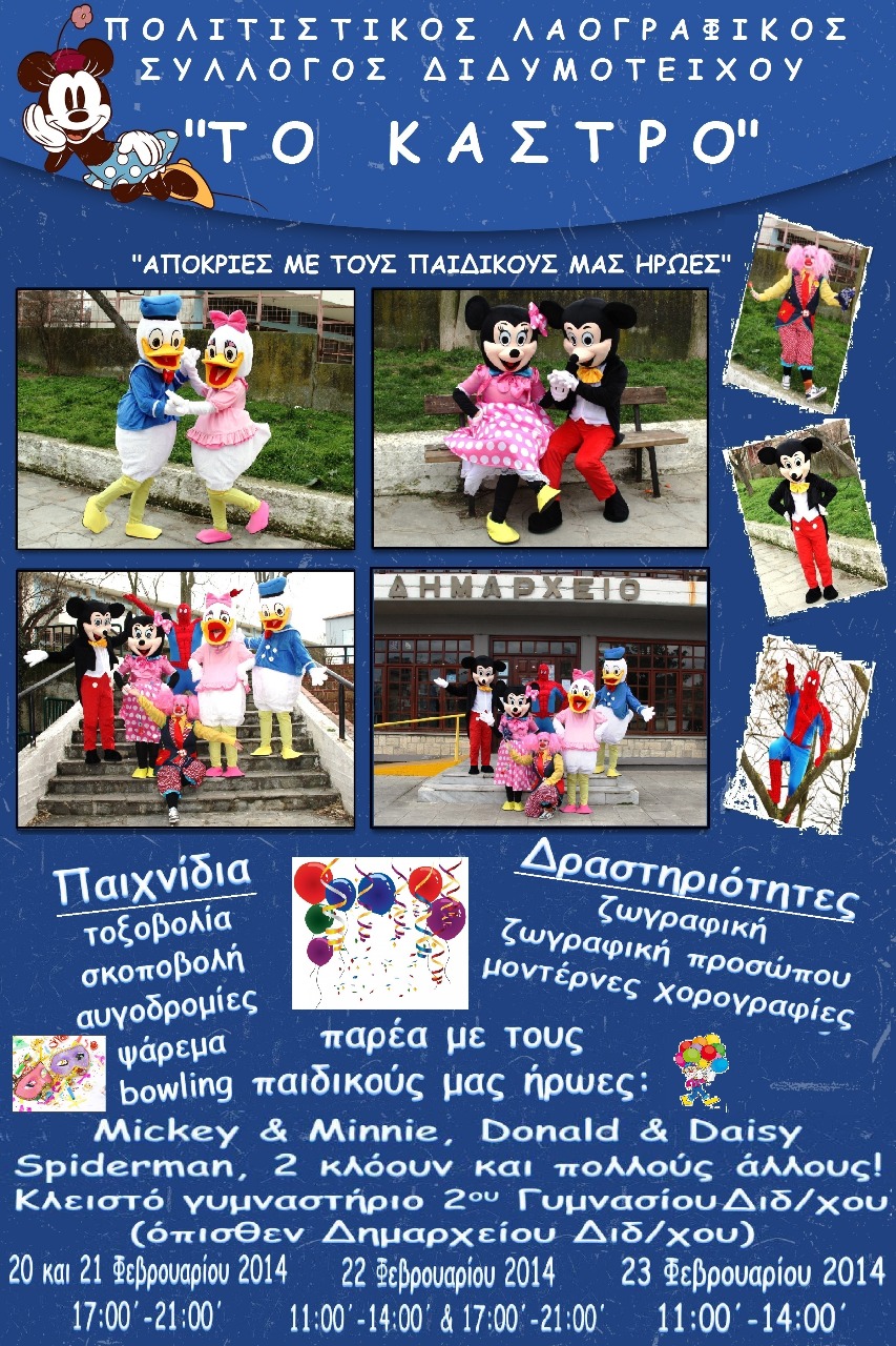 Ο Σύλλογος μας σας προσκαλεί όλους να έρθετε κοντά μας σε ένα ξέφρενο τετραήμερο αποκριάτικο γλέντι, με πολλά παιχνίδια για μικρά και μεγάλα... παιδιά, έπαθλα, μοντέρνες χορογραφίες και άλλες δραστηριότητες, από κλόουν και λατρεμένους παιδικούς ήρωες που μεγάλωσαν γενιές και γενιές! Φορέστε την αποκριάτικη στολή σας κι ελάτε 20 έως 23 Φεβρουαρίου 2014, στο κλειστό γυμναστήριο του 2ου Γυμνασίου Διδυμοτείχου, ακριβώς πίσω από το Δημαρχείο. Το πρόγραμμα λειτουργίας είναι το ακόλουθο: